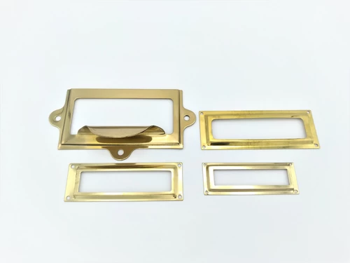Etiketramen vindt u vaak terug op oude meubels zoals archiefkasten. Bij ons vindt u zowel nikkel als messing etiketkramen, mét en zonder grepen. Supermooi om een oud meubel weer helemaal in stijl op te knappen. Uiteraard kunnen wij ook plaatjes graveren voor in de etiketramen.